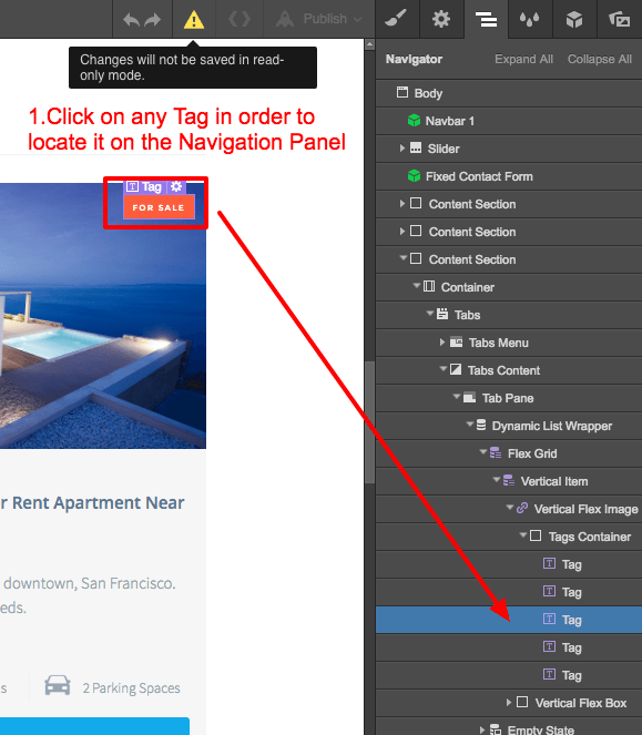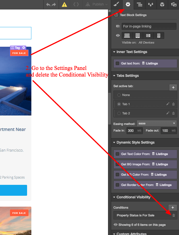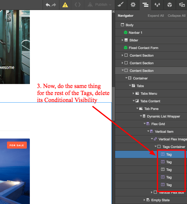 3. Click on each of the other Tags and do the same (delete its Condition of Visibility)