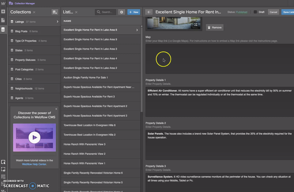 This is the Collection we use to List a Property. We used the 31 Collection Fields allowed to use in a Collection. We include all the Collection Fields we thought were important like: Descripcion, Photo Gallery, Video, Map, etc; but in case you need a different items you can change or even delete them.
